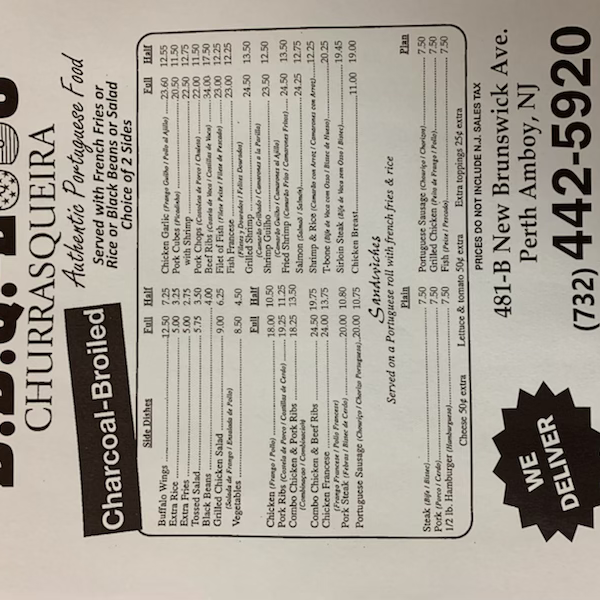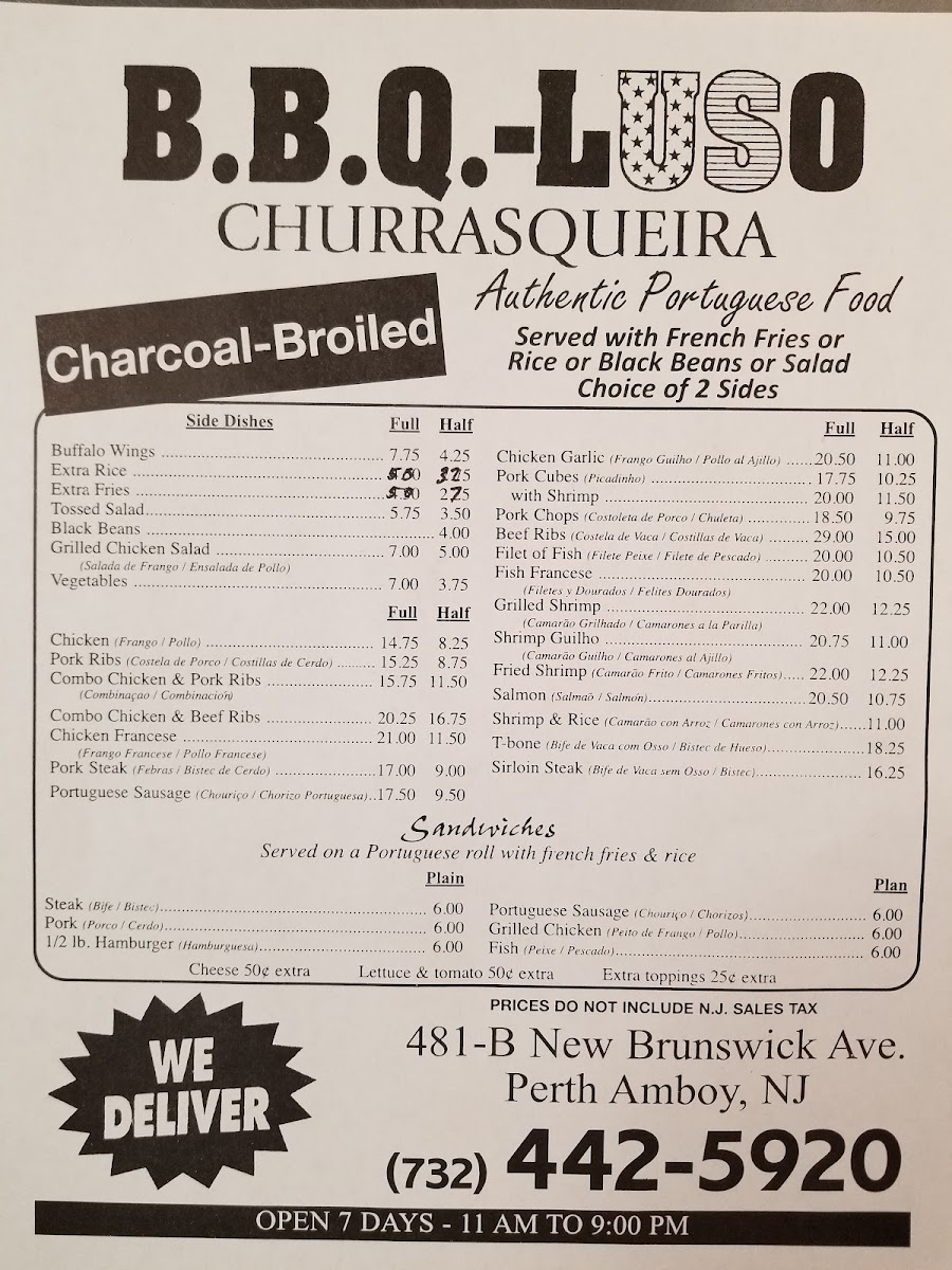 Welcome to B.B.Q. Luso, the heart of homestyle BBQ and authentic Portuguese cuisine right in Perth Amboy, NJ. Located at 481 New Brunswick Ave, this gem has garnered rave reviews for its generous portions and mouthwatering dishes.